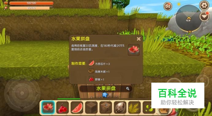 如图所示,水果拼盘是由方西瓜片、野果和简易木碗制作而成的,我们只需要分别获取采集这些原料,就可以合成水果拼盘了。