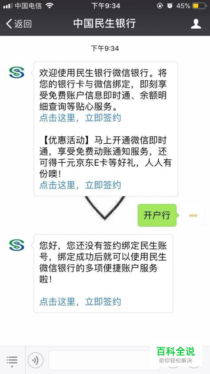 关注完毕进入公众号,输入“开户行”,这时候会提示需要绑定账号才可以使用便捷功能。