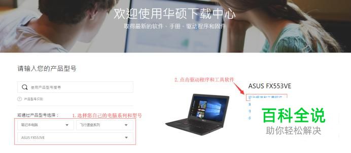 访问华硕ASUS官方网站,进入华硕ASUS的支持页面,如图选择自己华硕电脑的系列型号,再点击驱动程序和工具软件。(以下我们以飞行堡垒系列ASUS FX553VE型号为例)
