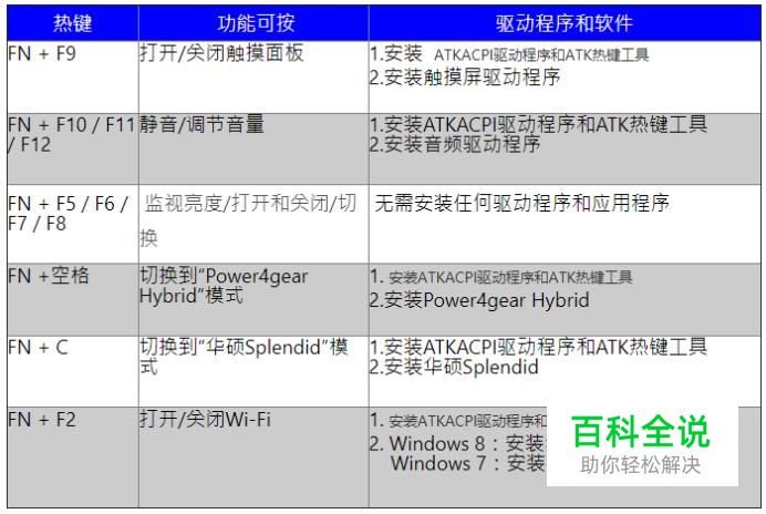 当华硕笔记本电脑的热键功能失效时,您可以通过华硕Live Update自动更新驱动程序及其应用程序,此外,您可以尝试下载最新的驱动程序和应用程序进行更新。如图表显示了常用热键的说明,以及需要下载和安装的驱动程序和应用程序。