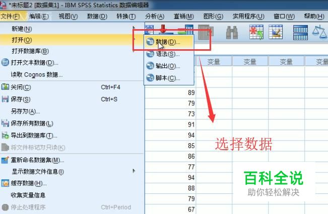 首先点击SPSS软件左上角的文件菜单,选择打开下面的数据选项,如下图所示