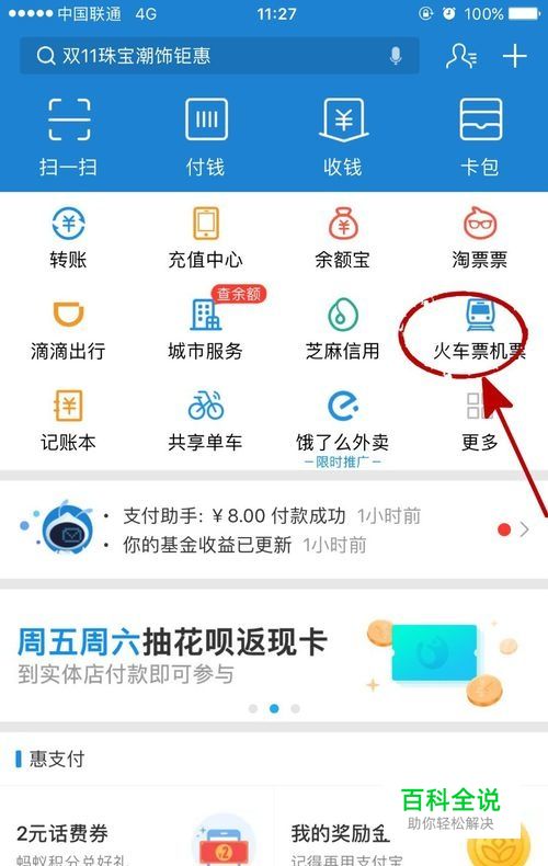 如图,找到支付宝首页,点开火车票机票