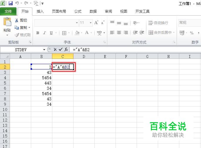 之后我们选中图示中的单元格,然后我们输入="A"&B2,之后我们按回车键;