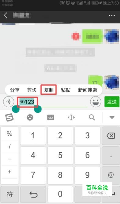 首先,我们点击打开一个微信的好友聊天窗口,然后我们输入框中输入带有特殊符号的昵称,之后选择这个昵称,然后我们点击复制,如图所示;