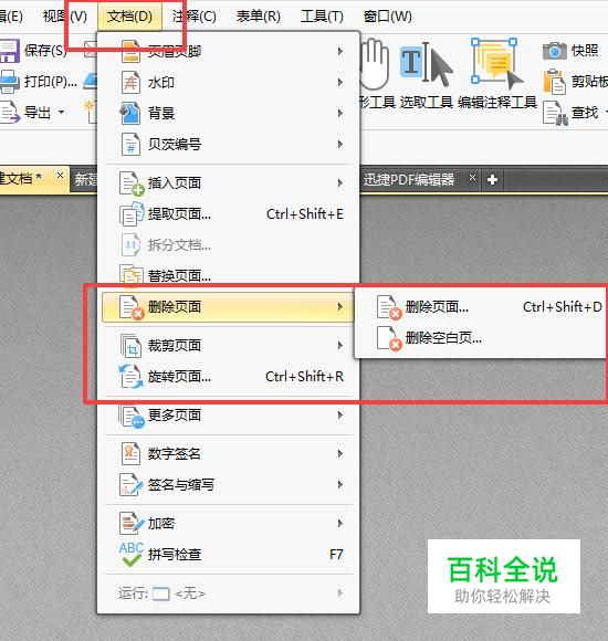 在修改文件的时候,使用PDF编辑软件进行编辑修改,点击菜单栏中的文档,然后选择文档中的删除页面,在删除页面中选择删除页面选项。