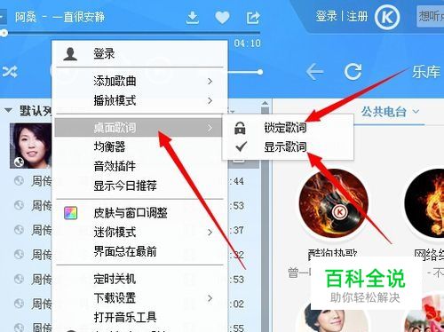 然后在如图所示的随意一个空白位置点右键,在弹出的菜单中选择桌面歌词,让歌词在桌面显示,以及解锁歌词,让歌词不被固定住
