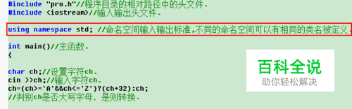char ch; //设置字符ch. cin >>ch; //输入字符ch. ch=(ch>='A'&&ch<='Z')?(ch+32):ch; //判别ch是否大写字母,是则转换.