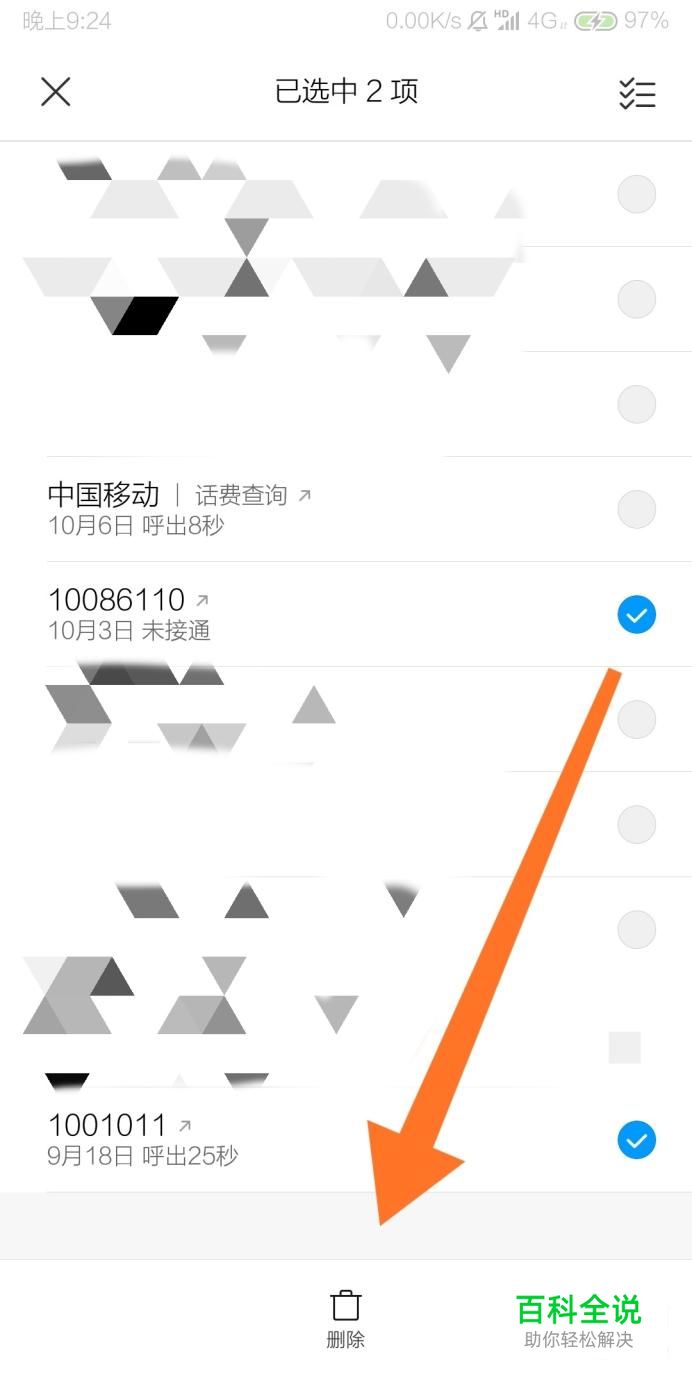 选择“批量删除”选项后,勾选需要删除的通话记录,接着点击屏幕底部的删除按钮即可。