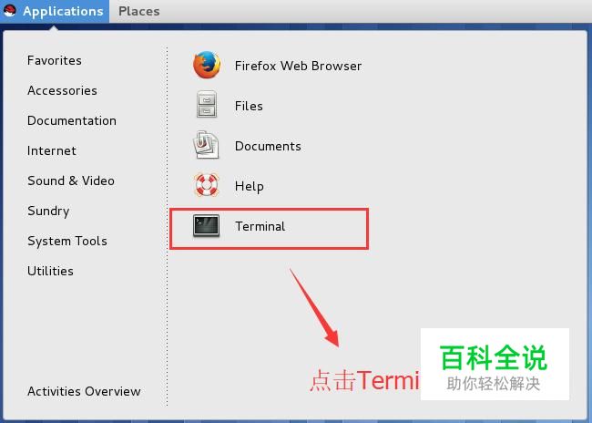 首先登录进redhat系统以后,点击左上角的Applications选项,然后选择Terminal,如下图所示