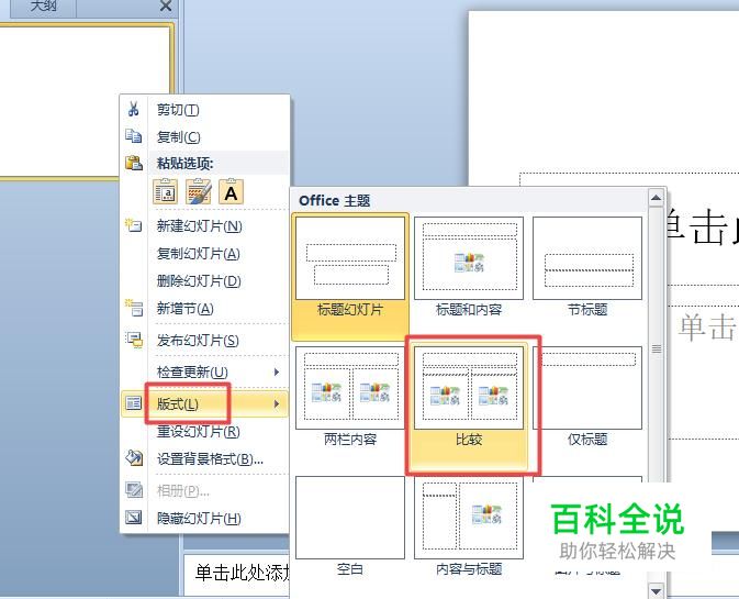 弹出的界面,我们点击版式,弹出的界面,我们可以看到很多版式,想要做精美的PPT,版式是至关重要的,我们点击选择比较;