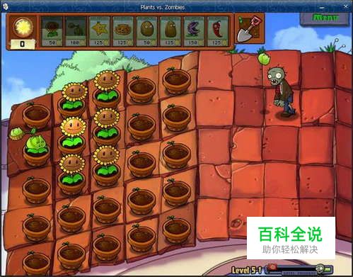关卡:5-1 终于来到了第五关。。可怜我的钱才7000+。。什么都没买。。 算了,买个钉耙,聊胜于无。。 格子还是8个。。 老套路,甭管他僵尸走到多近了,有钉耙的情况下,速度6花开局。。 然后 放一个白菜(卷心菜) 放一排石头,再来一排食人花。。没事加个套套。。 爽哉! 过关。 轻松拿下此关,得到花盆