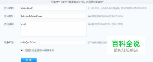填写申请表单,规则如下: 网站名称:填写 6 至 18 个数字或字母,如 dsfesdfesdf 网站地址:填写一个虚构的网址,必须以 .com、.cn 这种常见域名后缀结尾,如http://sdfsfsfasdf.com 网站说明:随便填写即可,如 wsdf 联系方式:填写一个虚构的邮箱,必须以 .com、.cn 这种常见域名后缀结尾,如sdfs@sdfsf.cn