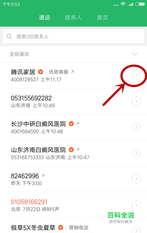当我们接到类似已经认证过的电话时,只需要打开通话列表页,然后点击圆圈里的“>”符号,进入号码详情页。PS:实名认证过的企业号码在通话列表页也会显示企业名称和企业LOGO的。