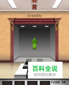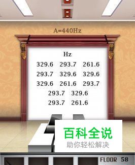 在100层电梯游戏第五十八关中,电梯门前有5个钢琴键,俩黑三白,黑色的钢琴键虽然能发出声音,但是过关用不到它。在电梯门上,总共有329.6、293.7、261.6三组数字,对应着电梯门前的三个白色钢琴键,白色钢琴键从左往右依次是:duo、re、mi,duo对应的是电梯门上的261.6、re对应的是电梯门上的293.7、mi对应的是电梯门上的329.6。