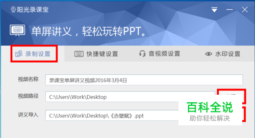1 双屏录制 点击录制设置进入录制设置界面。依次输入该微课的视频名称,点击视频路径右侧“选择”按钮进行视频保存位置的选择,点击讲义导入右侧“选择”按钮进行讲义导入操作。如下图所示: