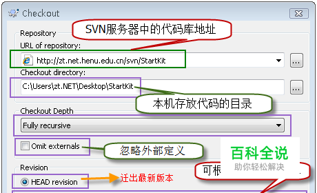 点击Import,弹出下面的窗体,其中http://zt.net.henu.edu.cn 是服务器名,svn是代码仓库的根目录,StartKit是我们在上个教程中添加的一个代码库。 说明:左下角的CheckBox,在第一次签入源代码时没有用,但是,在以后你提交代码的时候是非常有用的。