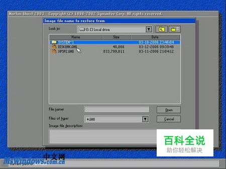 第2步,在打开的“File name to load image from(要装载的映像文件来自)”对话框中,单击Look in编辑框右侧的下拉三角按钮,在路径列表中选中事先保存有映像文件的分区。这时会在被选中分区的列表框中列出事先备份的映像文件(本例中的文件名称是Diskbak.GHO),单击硬盘驱动器映像文件,如图2010040808所示。 图2010040808 选择映像文件 小提示:大多数情况下,较新的Ghost版本能够还原由较旧版本Ghost创建的映像文件,而较旧的Ghost版本不能还原由较新版本Ghost创建的映像文件。另外如果在创建映像文件时使用了在较新的Ghost版本中不可用的选项或转换参数,则较新的Ghost版本可能无法还原该映像。使用Ghost单机版还原由较旧的Ghost企业版创建的映像时,通常会出现此问题。强烈用户在备份和恢复系统时采用同一Ghost版本。