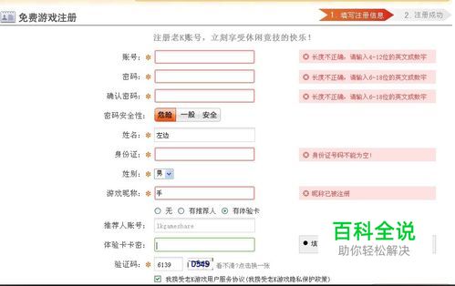游戏账号注册,带有“*”号的为必填项目,推荐人帐号和体验卡卡密最好在注册前弄到,因为那样你获得的金币数量会比别人的多很多的噢!!!