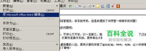 ①:使用Word来编辑 如下图,在IE或者其他浏览器的菜单中执行操作:“文件”→“用Microsoft Office Word编辑”;本方法只针对已安装WORD的计算机;如果没安装WORD,无法使用该功能! 执行操作以后,自动打开WORD软件,里面的文档内容即为网页中的内容,这个时候就可以轻松使用鼠标选择需要的文字了!