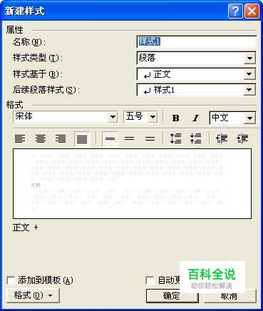 点击“确定”回到“新建样式”对话框中,你已经可以看到你对样式做了哪些修改。预览图下方的“正文 + 字体”等一串文字就详细地说明了该样式和基准样式比较已经做了哪些修改。