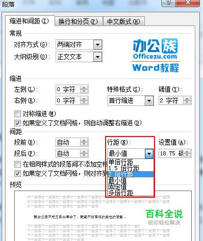 弹出“段落”窗口,然后单击“行距”下拉三角按钮。在“行距”下拉列表中选择合适的行间距,并单击“确定”按钮。
