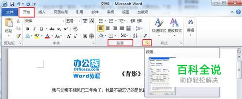 打开Word2010文档窗口,选中其中一段文本。在“开始”功能区的“段落”分组中单击显示段落对话框按钮。