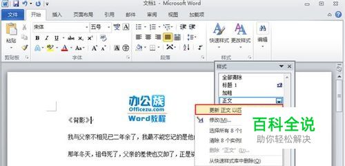 打开“样式”面板,单击“正文”右侧的下拉三角按钮。在打开的下拉菜单中单击“更新 正文 亦匹配所选内容”命令,然后点击。