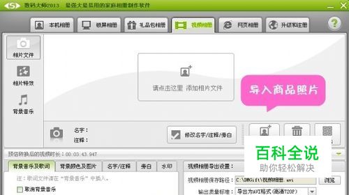将拍摄的商品宣传照悉数导入软件中,巧用文字特效功能,图文并茂展示 淘宝视频制作可以很简单。作为一款人人都会用的精美相册制作软件,《数码大师》完美的击破了“制作视频专业要求很高”的思想。通过数码大师,我们不仅可以将视频在淘宝网站上分享,还能分享到其它视频网站、论坛、贴吧等,宣传力度绝对比简单的图片要好很多。当然如果你还有实体店,那就可以直接在店内播放,一劳永逸。 制作视频的长度,最好控制在3-5分钟内,方便顾客在几分钟内就可以获得他想要了解的信息。点击“添加相片”按钮,将相片悉数导入软件,用鼠标拖拽相片,即可快速调整相片的播放顺序。利用文字特效功能,为图片添加名字/注释,写下一段精简的旁白,作为你的商品解说。