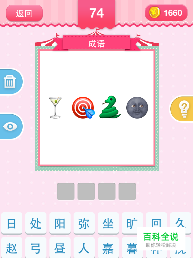 疯狂猜表情成语答案 ios版emoji猜猜乐成语答案 1.哭笑不得 2.八面玲珑 3.三心二意 4.惺惺相惜 5.杯水车薪 6.不三不四 7.蛇鼠一窝 8.驷马难追 9.头头是道 10.一气呵成 11.望闻问切 12.朝三暮四 13.开门见山 14.衣食父母 15.走马观花 16.九牛一毛 17.守株待兔 18.画蛇添足 19.佛口蛇心 20.狼心狗肺 21.冰天雪地 22.狡兔三窟 23.鸟语花香 24.一石二鸟 25.星月兼程 26.奇花异草 27.雪上加霜 28.鸡飞狗跳 29.春花秋月 30.三姑六婆 31.狐朋狗友 32.杯弓蛇影 33.惊弓之鸟 34.出双入对 35.朝夕相对 36.狗急跳墙 37.草木皆兵 38.鸦雀无声 39.鱼目混珠 40.美中不足 41.车水马龙 42.风雨无阻 43.不动声色 44.萍水相逢 45.小鸟依人 46.风花雪月 47.不明所以 48.风雨同路 49.怒发冲冠 50.妖魔鬼怪 51.盲人摸象 52.量体裁衣 53.面如死灰 54.虎头蛇尾 55.鱼贯而入 56.左右逢源 57.泪如雨下 58.兔死狗烹 59.精忠报国 60.调虎离山 61.机关算尽 62.灯红酒绿 63.阳春白雪 64.左右开弓 65.雨过天晴 66.鸡犬不宁 67.对牛弹琴 68.三教九流 69.雪中送炭 70.风月无边