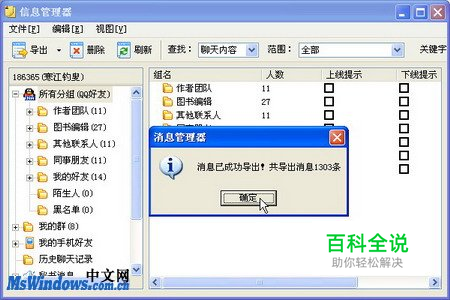 第2步,打开“另存为”对话框,指定合适的保存位置和文件名,并单击“保存”按钮。备份文件成功导出后会弹出“消息管理器”对话框,提示用户消息导出成功。单击“确定”按钮即可,如图2010040859所示。 图2010040859 消息导出成功