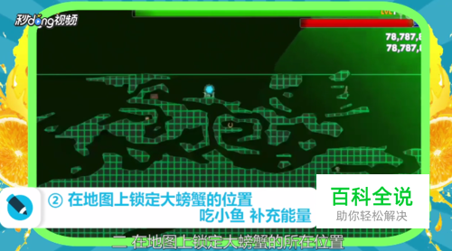 在地图上锁定大螃蟹的所在位置,路上可以吃小鱼补充能量。