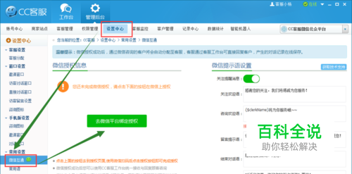 第二步,进入管理后台 > 设置中心 > 微信互通,按提示点击【去微信平台绑定授权】。