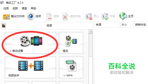 1、使用格式工厂转化成为手机可以播放的格式,这里我们点击第一个,也就是“→移动设备”,转化视频文件格式为适合手机播放的格式。