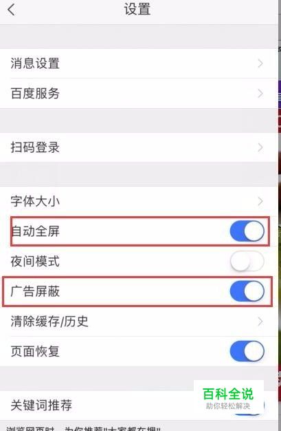 第五步,直接在自动全屏与广告屏蔽点击打开,当左方显示到蓝色时,则代表处于开启状态。如图所示: