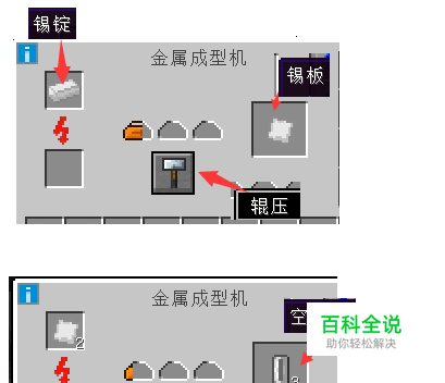 制作空单元 空单元需要使用【金属成型机】 把【锡锭】放入【金属成型机】后,经过【辊压】得到【锡板】 再把【锡板】放入【金属成型机】,模式选择【挤压】成为【空单元】 准备最少三个空单元