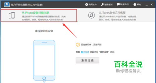 将苹果手机与电脑连接, 并且运行软件,点击“从iphone设备扫描恢复”,