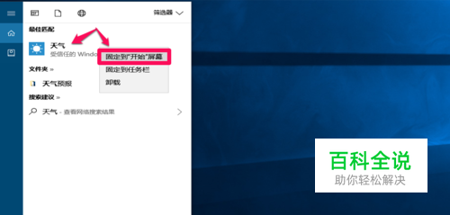 Windows10系统天气预报精确定位和实时更新的设置方法 第一步:将天气预报程序固定到开始屏幕和任务栏。 在系统桌面左下角的搜索栏中输入“天气”,右键点击【最佳匹配】下的“天气 - 受信任的Windows 应用商店应用 ”,在右键菜单中点击: 固定到“开始”屏幕和 固定到任务栏;