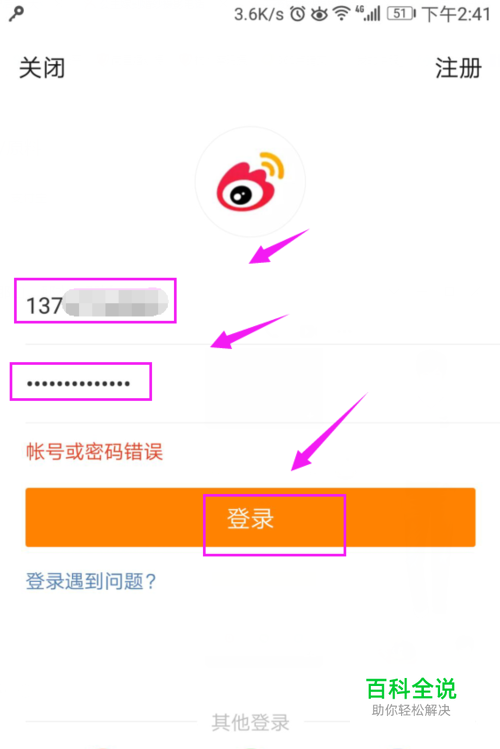 打开手机微博,来到登录界面,输入手机号,密码,进行登录,如图。
