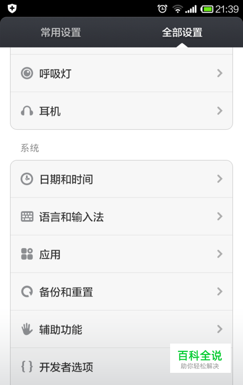 首先,打开手机的“设置->全部设置“,从中找到”应用“这一项。现在的android手机都有的,耐心找一下,肯定能找到。如下图所示: