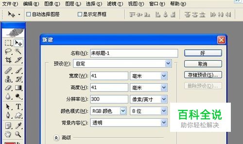打开“Adobe Photoshop”,新建长宽都是41毫米,分辩率300,背景为透明,RGB图像文件