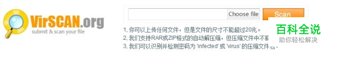 1、在choose file处上传可疑的文件,注意大小不能超过20M,如果太大也可以自行压缩,因为它会识别压缩文件。下图是选择我上传的一个文件。