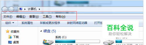 双击打开“计算机”,在左上角找到“组织”菜单,如图所示。