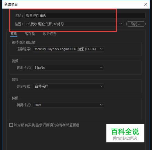 打开PR视频剪辑软件,新建一个项目,在弹出的新建项目设置窗口中,将项目名称命名为“效果控件描边”,选择一个保存位置,其他相关的设置可以保持默认或者根据你自己的要求进行相应的设置。
