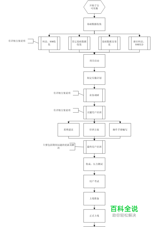 整个实施流程文档是根据实施先后顺序进行编写,以小模块为单元(即:每个模块的操作流程以单独的文档及操作流程说明),方便实施时将各个模块的要求下发给各个相关的负责人处进行实行。
