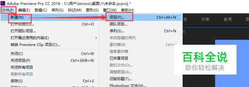 首先打开我们电脑上的Pr软件,在文件子菜单中新建一个项目。如图所示。