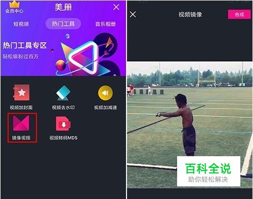 美册短视频专区,选择“拼接视频”入口,按顺序选择原视频和镜像后的视频,点击右下角选择,进入开始制作。