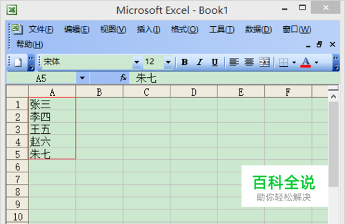 在A1-A5单元格中输入 张三 李四 王五 赵六 朱七