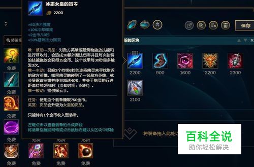 第一件装备购买冰霜女皇的指令。 可以增加露露的法术强度,冷却缩减和基础法力回复,同时可以获得金币,让露露更快的出装。