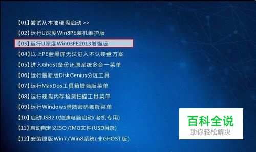 在u深度主菜单中选择【03】运行U深度Win03PE2013增强版,按下回车键确认,如下图所示:
