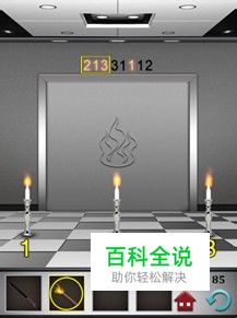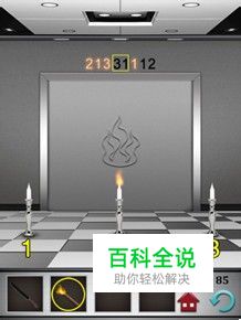 电梯门上方是两种不同颜色的数字,门前有三支蜡烛,从左到右为1、2、3.门上方的数字给与过关的提示,橙色的“213”表示用储物箱中的火把依次点燃213蜡烛。